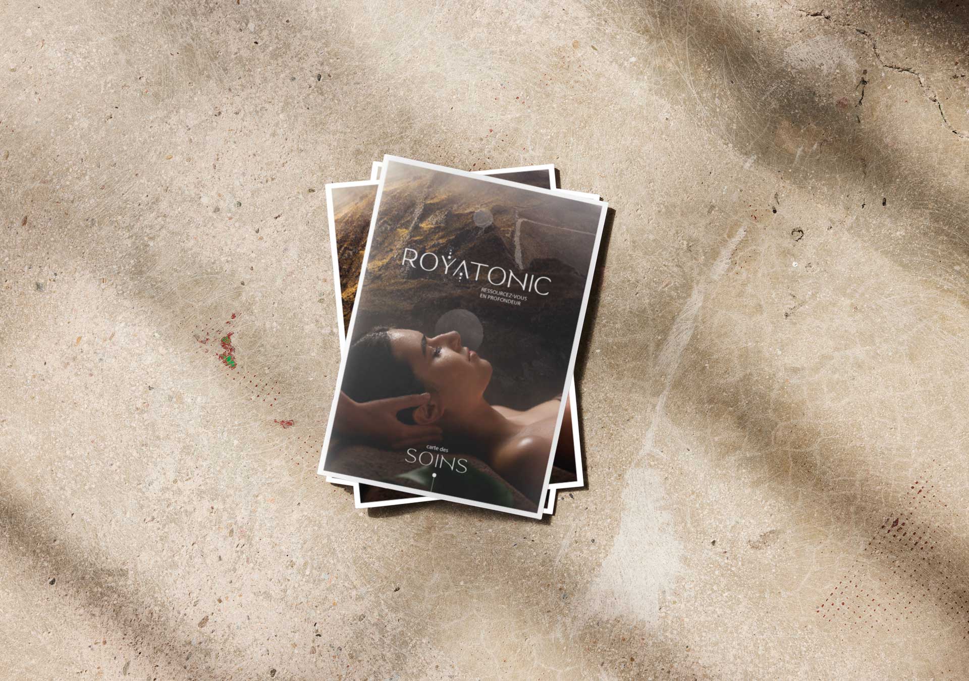 Depuis 2021, nous accompagnons Royatonic sur son identité de marque, sa stratégie de communication et la création de supports variés : brochures de soins et spa, signalétique, annonces presse, flyers, outils promotionnels et stand événementiel.